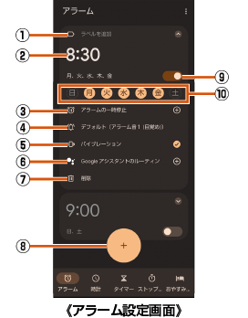 ホーム画面→「アプリ一覧画面」を表示→[時計]→[アラーム]