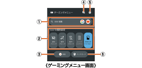 「登録ゲーム設定」で有効に設定したアプリを起動中に表示されるゲーミングメニューのフローティングアイコンをタップすると、ゲーミングメニュー画面が表示されます。ゲーム画面の録画や攻略サイトの検索などゲーミングメニューの機能が利用できます。