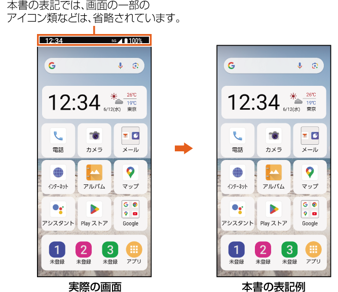 本書ではお買い上げ時のホーム画面での操作を基準に記載しています。「ホーム切替」などでホームアプリを切り替えた場合は、操作が異なる場合があります。 |