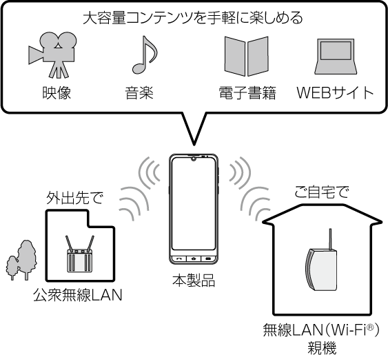 家庭内で構築した無線LAN(Wi-Fi®)環境や、外出先の公衆無線LAN環境を利用して、インターネットサービスに接続できます。