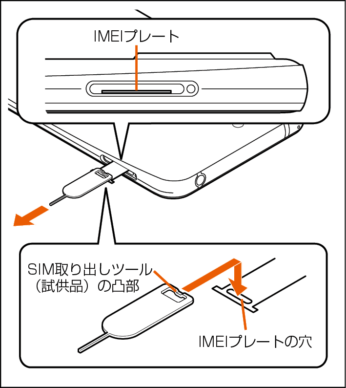 IMEIプレートを引き出す時は、付属のSIM取り出しツール(試供品)を使用してください。 |