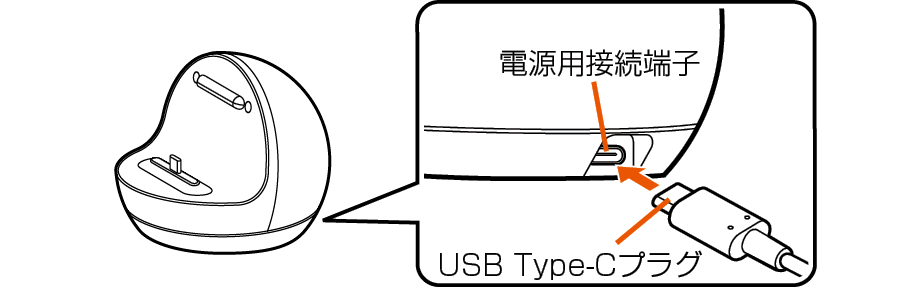 TypeC共通ACアダプタ02(別売)のUSB Type-Cプラグを、本製品の外部接続端子に矢印の方向に差し込む