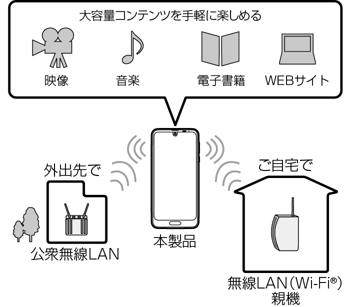 家庭内で構築した無線LAN(Wi-Fi®)環境や、外出先の公衆無線LAN環境を利用して、インターネットサービスに接続できます。
