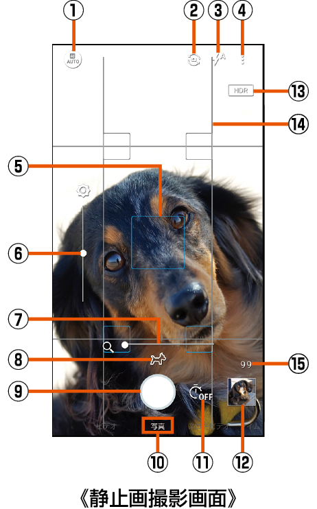 」に設定している場合に表示されます。タップすると標準アウトカメラで静止画を撮影します。