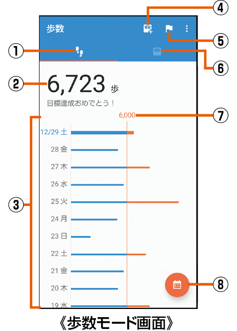 日々/月々の歩数が棒グラフで表示されます。グラフをタップすると、選択した日/月の歩数や歩行距離、消費カロリーなど、詳細情報が表示されます。