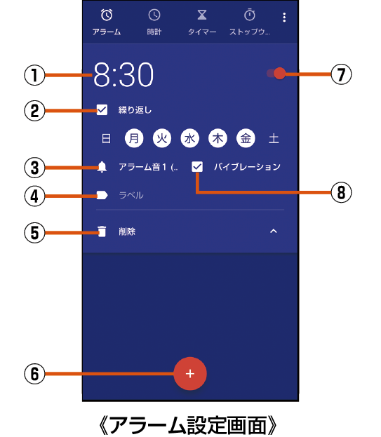 ホーム画面→「アプリ一覧画面」を表示→[時計]→[アラーム]