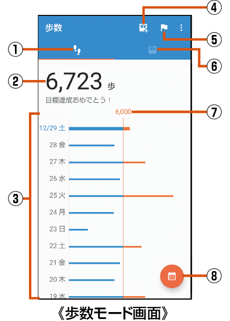 日々/月々の歩数が棒グラフで表示されます。グラフをタップすると、選択した日/月の歩数や歩行距離、消費カロリーなど、詳細情報が表示されます。