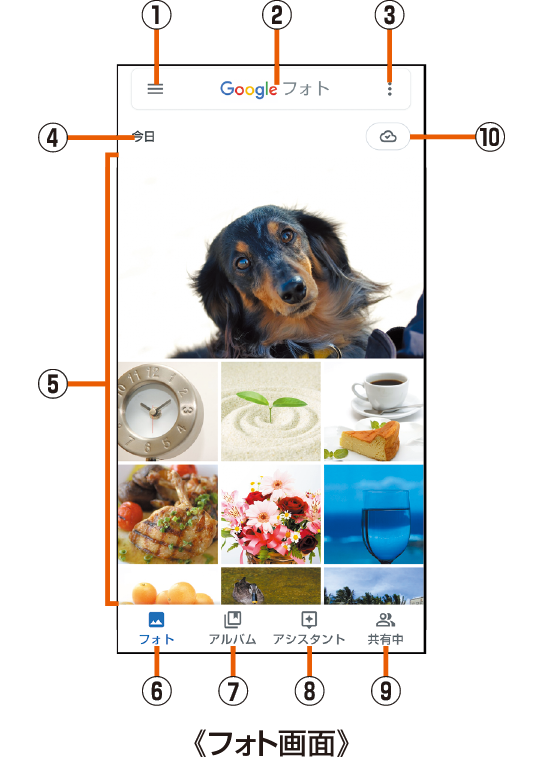 ホーム画面→「アプリ一覧画面」を表示→[フォト]