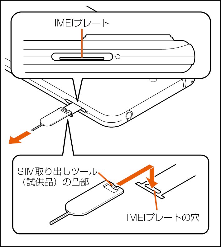 IMEIプレートを引き出す時は、付属のSIM取り出しツール(試供品)を使用してください。 |