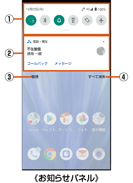 お知らせ/ステータスパネルでは、お知らせアイコンやステータスアイコンの確認や対応するアプリケーションの起動ができます。