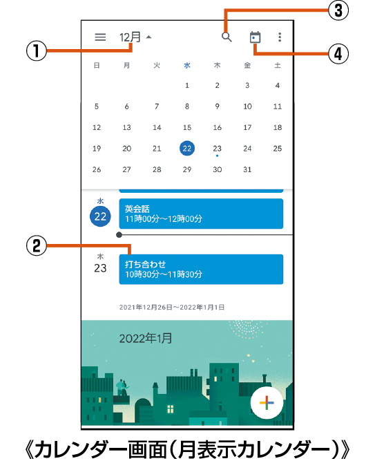 カレンダーの利用にはGoogleアカウントの設定が必要です。詳しくは、『設定ガイド Android 11対応版』をご参照ください。