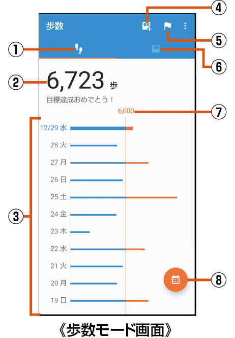 日々/月々の歩数が棒グラフで表示されます。グラフをタップすると、選択した日/月の歩数や歩行距離、消費カロリーなど、詳細情報が表示されます。