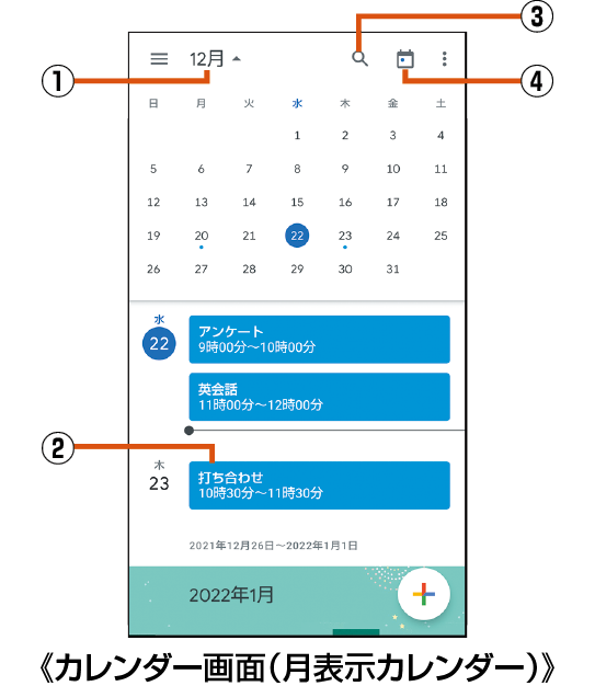 カレンダーの利用にはGoogleアカウントの設定が必要です。詳しくは、『設定ガイド Android 11対応版』をご参照ください。