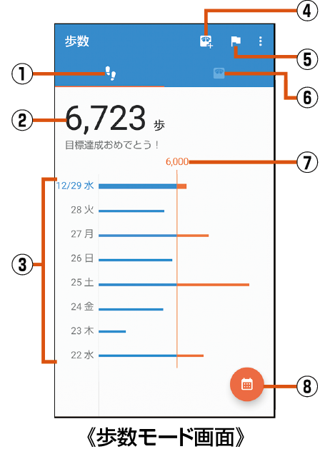 日々/月々の歩数が棒グラフで表示されます。グラフをタップすると、選択した日/月の歩数や歩行距離、消費カロリーなど、詳細情報が表示されます。