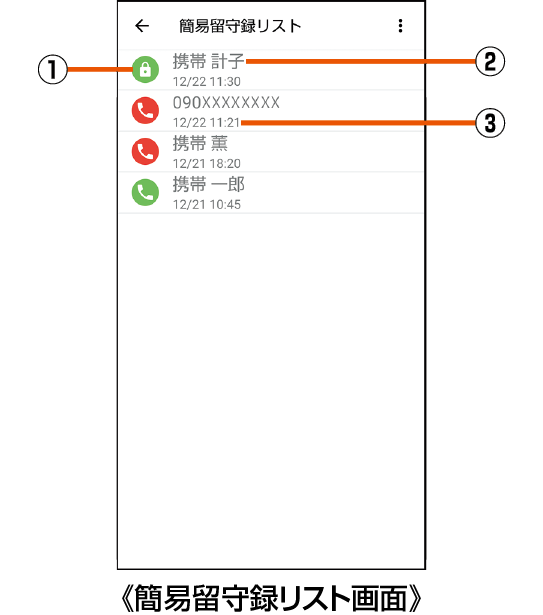 簡易留守録リスト画面/通話音声メモリスト画面が表示されます。