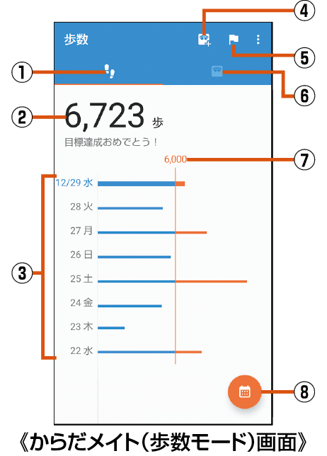 歩数や体重などを記録できます。歩数、体重の履歴をグラフで表示して、日別/月別で比較することもできます。