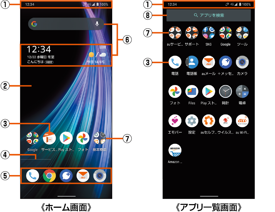 ホーム画面のデスクトップシートにはアプリ/機能のショートカット/ウィジェット、お気に入りトレイにはアプリ/機能のショートカットを登録することができます。アプリ一覧画面にはインストールされているアプリが表示されます。