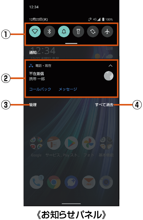 お知らせ/ステータスパネルでは、お知らせアイコンやステータスアイコンの確認や対応するアプリケーションの起動ができます。