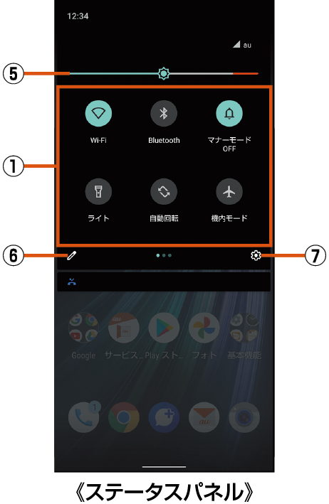 画面を上下にスライドすると、お知らせパネル/ステータスパネルを切り替えられます。 |