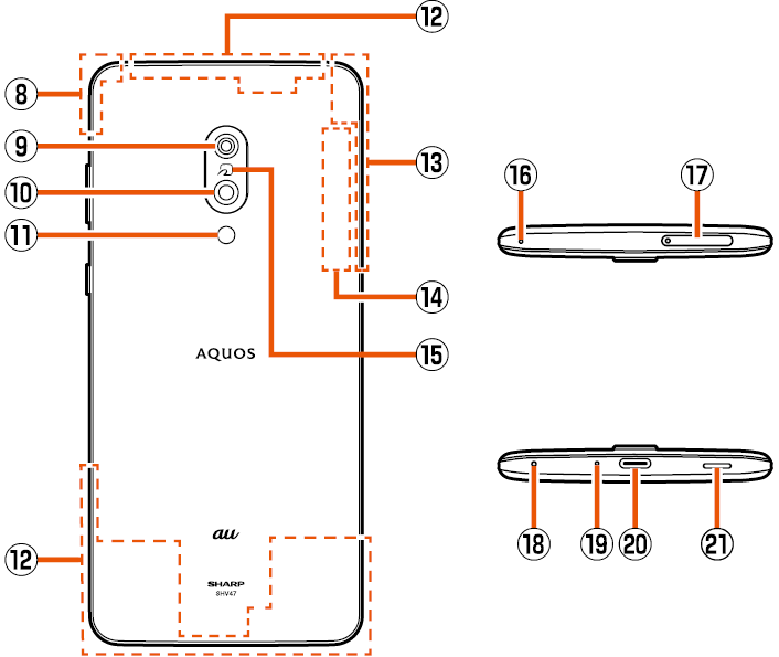 受話口(レシーバー)/スピーカー、サブマイク、送話口(マイク)、スピーカー、空気抜き部(カメラ飾り部)について 受話口(レシーバー)/スピーカー、サブマイク、送話口(マイク)、スピーカー、空気抜き部(カメラ飾り部)をシールや指などでふさぐと性能を維持できなくなりますので、ご注意ください。 |