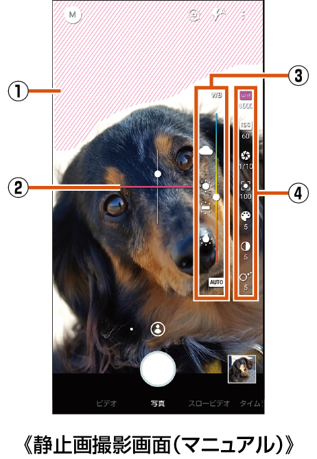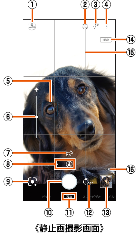 撮影モードが「写真」/「ビデオ」の場合は撮影環境や被写体に合わせて撮影メニューを切り替えることができます。