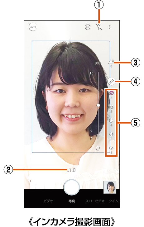 インカメラ利用時には、AQUOS beauty(アクオス ビューティー)機能で被写体の顔を補正することができます。