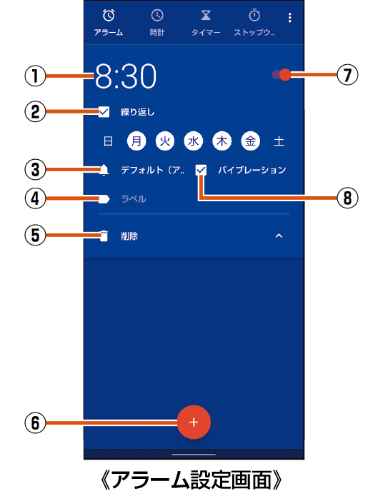 ホーム画面→「アプリ一覧画面」を表示→[時計]→[アラーム]