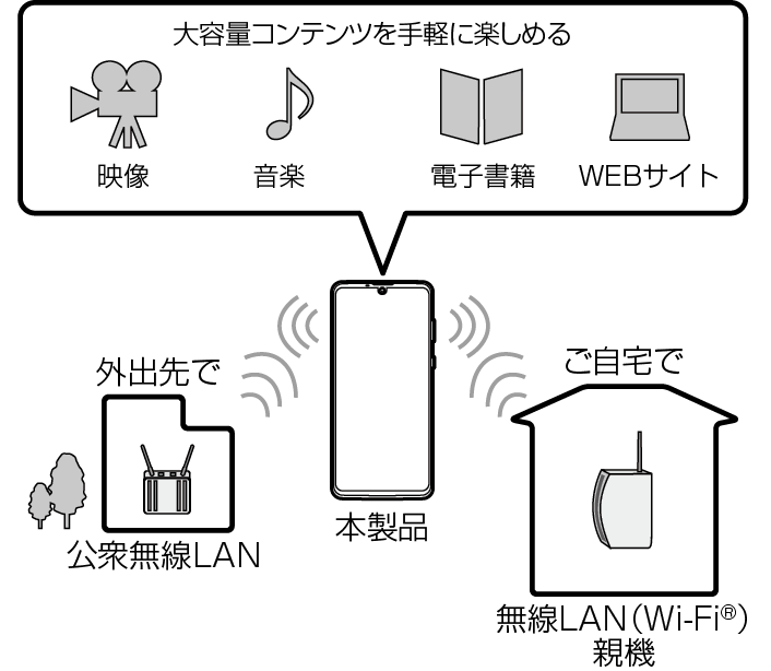 家庭内で構築した無線LAN(Wi-Fi®)環境や、外出先の公衆無線LAN環境を利用して、インターネットサービスに接続できます。