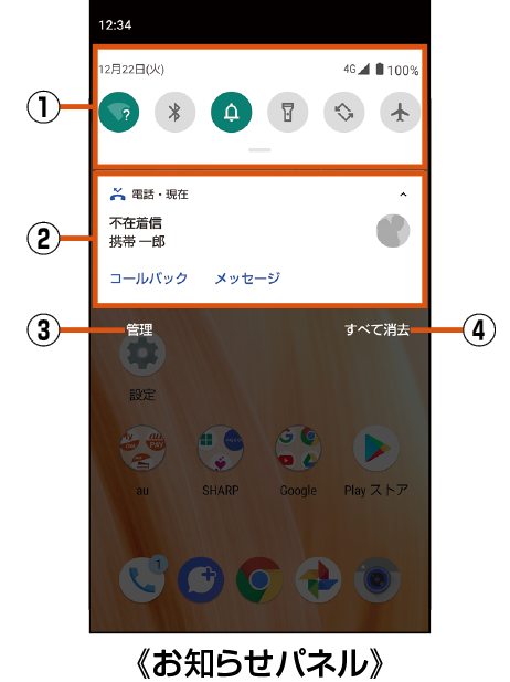 お知らせ/ステータスパネルでは、お知らせアイコンやステータスアイコンの確認や対応するアプリケーションの起動ができます。