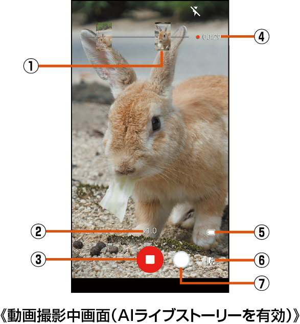 直前に撮影したデータのサムネイルを表示します。タップするとデータの確認などができます。AIライブストーリーによってショートムービーが作成された場合は、「