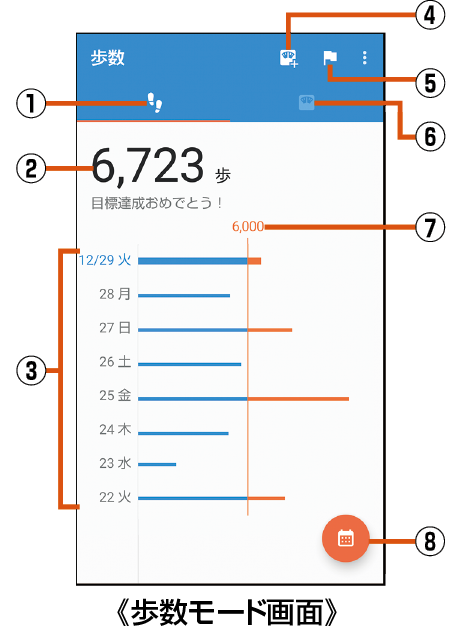 日々/月々の歩数が棒グラフで表示されます。グラフをタップすると、選択した日/月の歩数や歩行距離、消費カロリーなど、詳細情報が表示されます。