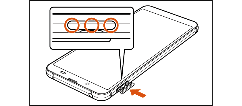 au ICカード/microSDメモリカードトレイを閉じるときは、ゴムパッキンを挟まないように注意してください。また、au ICカード/microSDメモリカードトレイの隙間、イヤホンマイク端子部、外部接続端子部に、先の尖ったものを差し込まないでください。