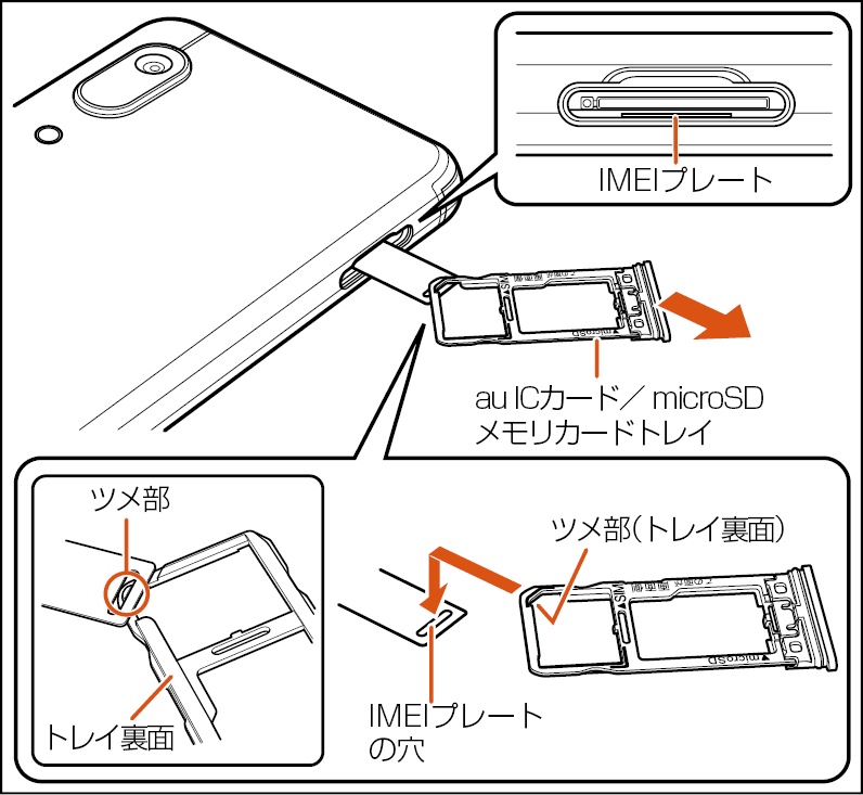 IMEIプレートについて au ICカード/microSDメモリカードトレイの挿入口付近には、IMEI情報(端末識別番号)を印刷したシールが貼られたプレートが収納されています。修理依頼やアフターサービスなどで、IMEI番号が必要となる場合を除き、プレートを引き出さないでください。また、シールをはがしたりしないでください。 |