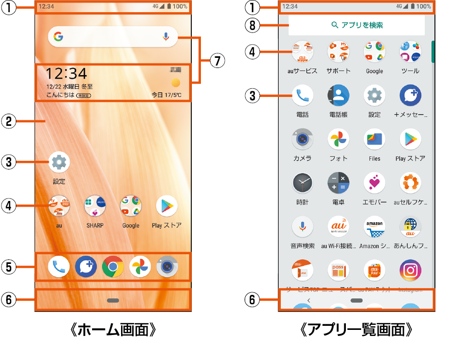 AQUOS Homeは、ホーム画面(デスクトップシート/お気に入りトレイ)とアプリ一覧画面で構成されたホームアプリです。