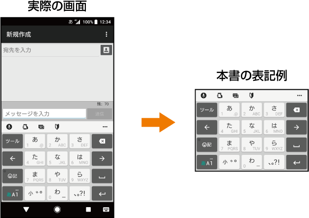 本書では、縦画面表示での操作を基準に説明しています。横画面表示では、メニューの項目/アイコン/画面上のボタンなどが異なる場合があります。