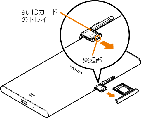 au ICカードのトレイの突起部に指先(爪)をかけてまっすぐに引き出し、本体からトレイを取り外す