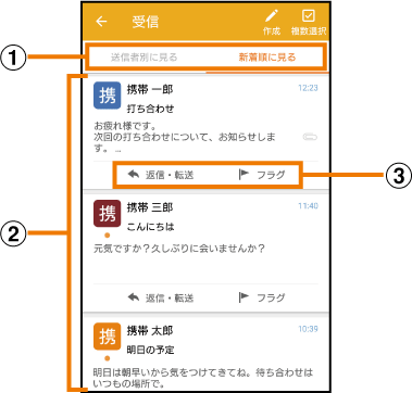 送信者別表示画面の場合は、送信者をタップしてから閲覧するメールをタップします。