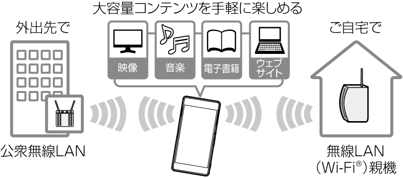 家庭内で構築した無線LAN(Wi-Fi®)環境や、外出先の公衆無線LAN環境を利用して、インターネットサービスに接続できます。