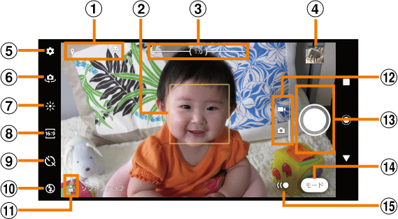 「フォト」モードと「ビデオ」モードを切り替えます。横画面では上下に、縦画面では左右にスワイプ(フリック)します。
