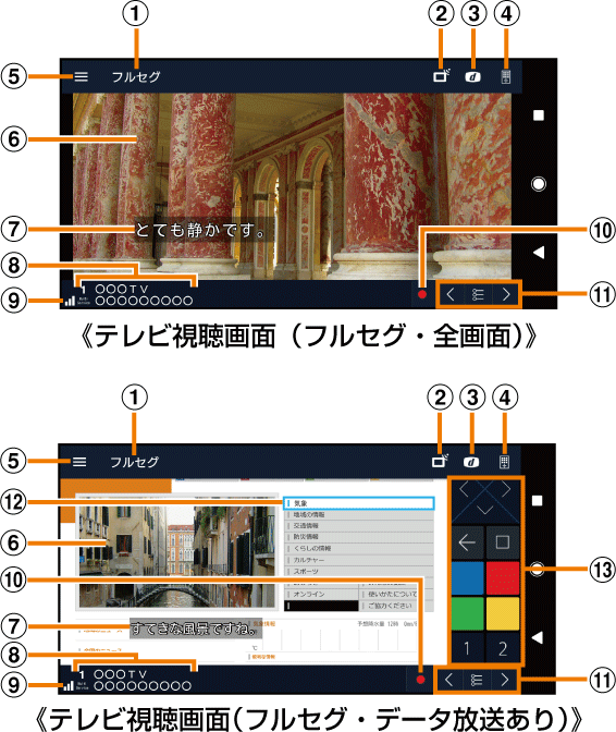 データ放送コンテンツが表示されます。ワンセグの視聴画面では、縦画面でのみ表示されます。