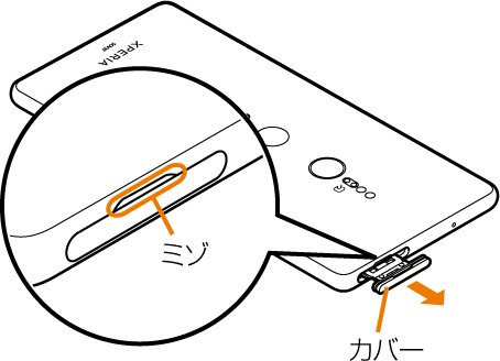 microSDメモリカード/au ICカード(SIMカード)挿入口のミゾに指先(爪)をかけて、カバーを矢印の方向に引き出す