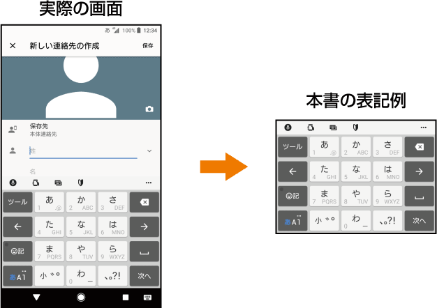 本書では、メニューの項目/アイコン/画面上のボタンなどをタップ(こちら)する操作を、[(項目などの名称)]と省略して表記しています。