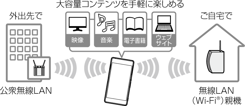 家庭内で構築した無線LAN(Wi-Fi®)環境や、外出先の公衆無線LAN環境を利用して、インターネットサービスに接続できます。