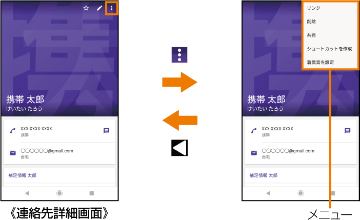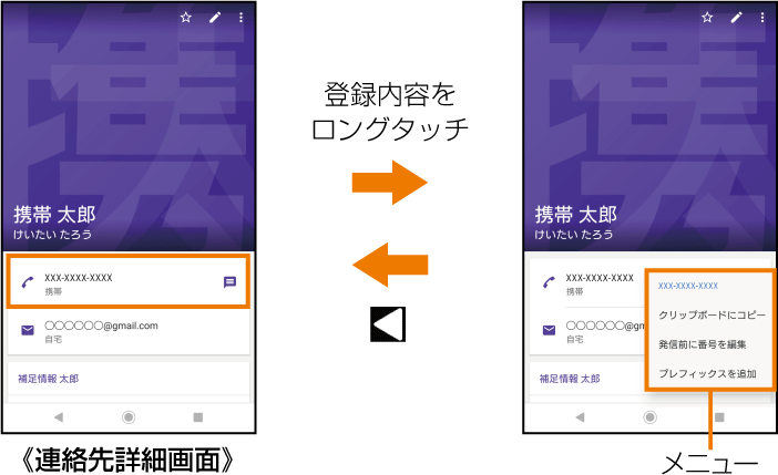 連絡先詳細画面で登録内容をロングタッチする場合