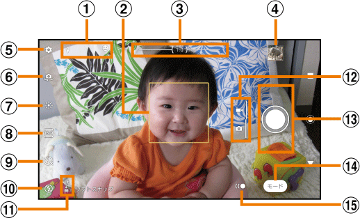 設定によっては、セルフタイマーや画面タッチ撮影のアイコンが表示されます。
