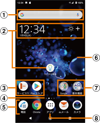 操作上の開始画面となるページを変更するには、変更するページに切り替えて、ホーム画面でアイコンなどがない部分をロングタッチ→画面左上に表示される[