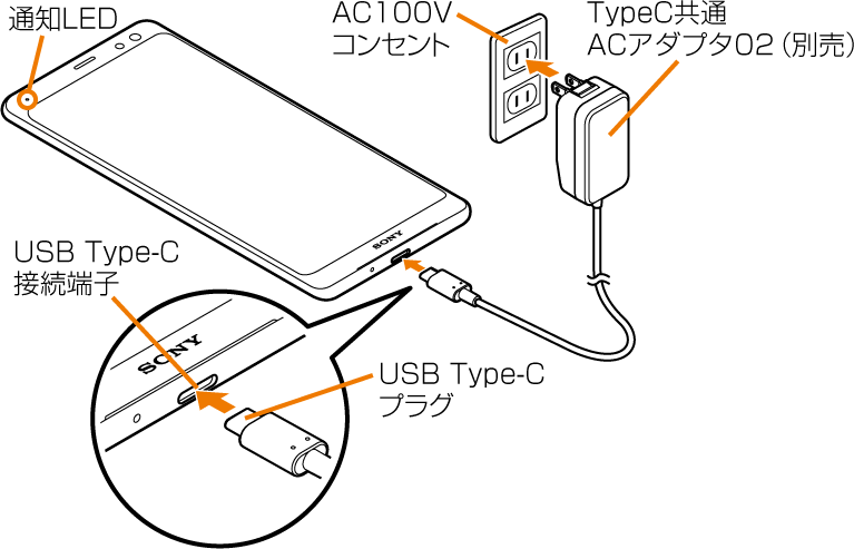 TypeC共通ACアダプタ02(別売)を接続して充電する方法を説明します。