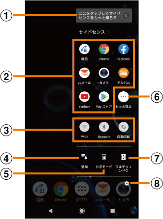 画面外側の縁をダブルタップすると、サイドセンスメニューが表示され、アプリの起動や機能のオン/オフなどができます。