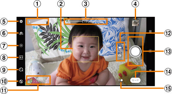 「フォト」モードと「ビデオ」モードを切り替えます。横画面では上下に、縦画面では左右にスワイプ(フリック)します。