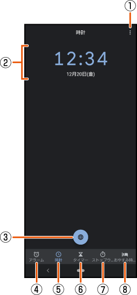 アラームを設定できるほか、世界時計を表示させたり、ストップウォッチやタイマーを使用したりできます。